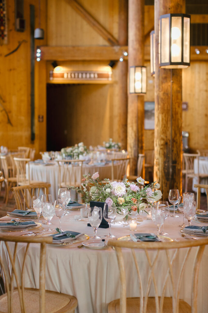 Few wedding venues in Colorado can claim the kind of character that SaddleRidge brings to the table. Originally designed by Ralph Lauren and built as a private retreat, SaddleRidge is home to one of the largest collections of American Western antiques and artifacts outside of a museum — think Geronimo’s tomahawk, General Custer’s hat and canteen, and railroad chandeliers hanging from forty-foot vaulted timber ceilings. The result is a venue that feels genuinely storied rather than decorated, which makes for a wedding environment that is rich with detail and deeply atmospheric. Ceremonies can take place in the back courtyard, a lush garden surrounded by an aspen grove that offers beautiful soft light in the afternoon, while the interiors — with their grand windows, stone fireplace, and warm wood tones — make for a reception space that needs very little to feel spectacular.
