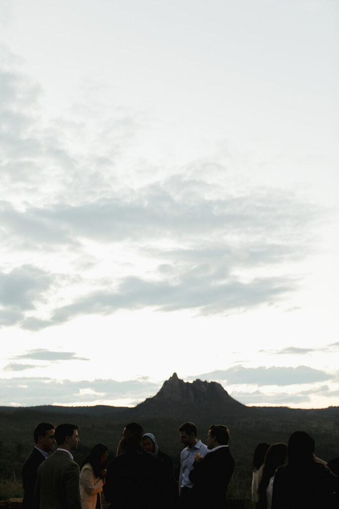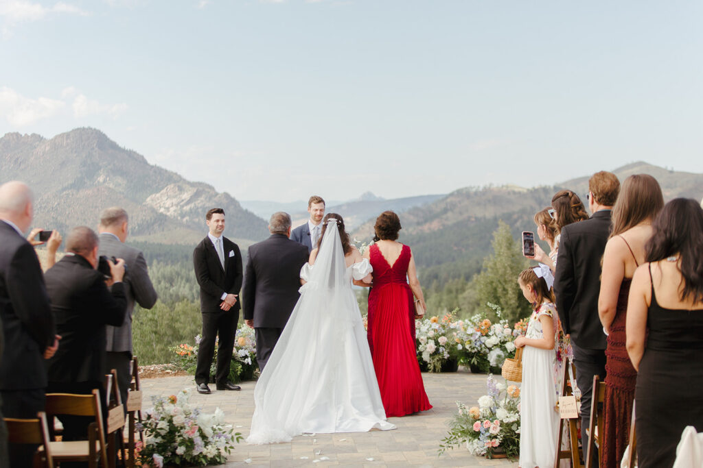 The hilltop ceremony site is something special. Elevated above the valley with 360-degree mountain views, it creates this incredible sense of being on top of the world — just you two and the people you love most, with the Rockies stretching out behind you.